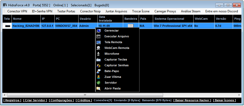 2. Keylogger Integrado: Como muitos RATs, o Hidra Force possui um keylogger embutido, permitindo capturar todas as teclas digitadas pela vítima. Isso inclui senhas, mensagens e outras informações sensíveis.