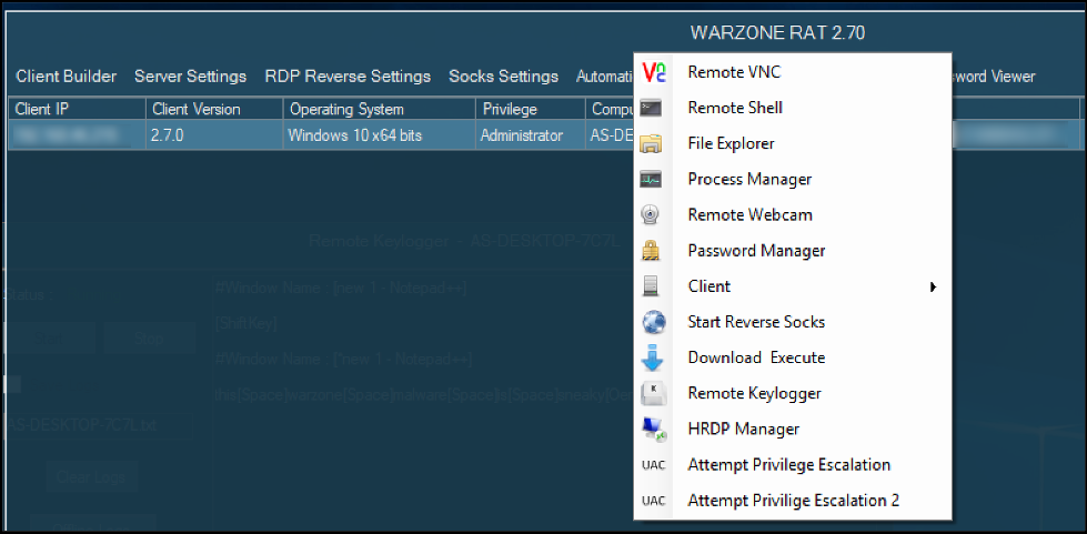 - O Warzone RAT proporciona controle total sobre o dispositivo da vítima, permitindo que os atacantes executem comandos remotamente.